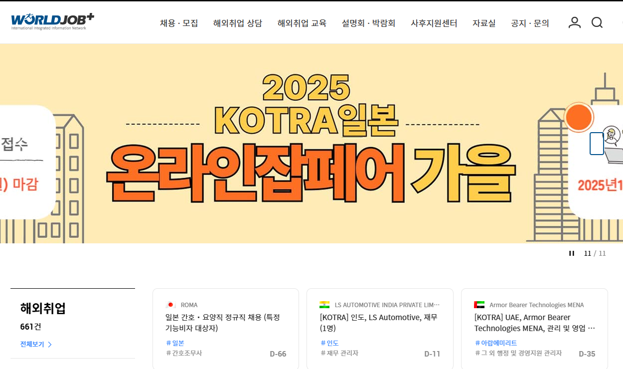 취업 알선 뿐만아니라 취업 박람회나 이력서 첨삭 등 다양한 도움을 받을 수 있으니 해외취업을 계획중이라면 한번쯤을 보게되는 사이트입니다.